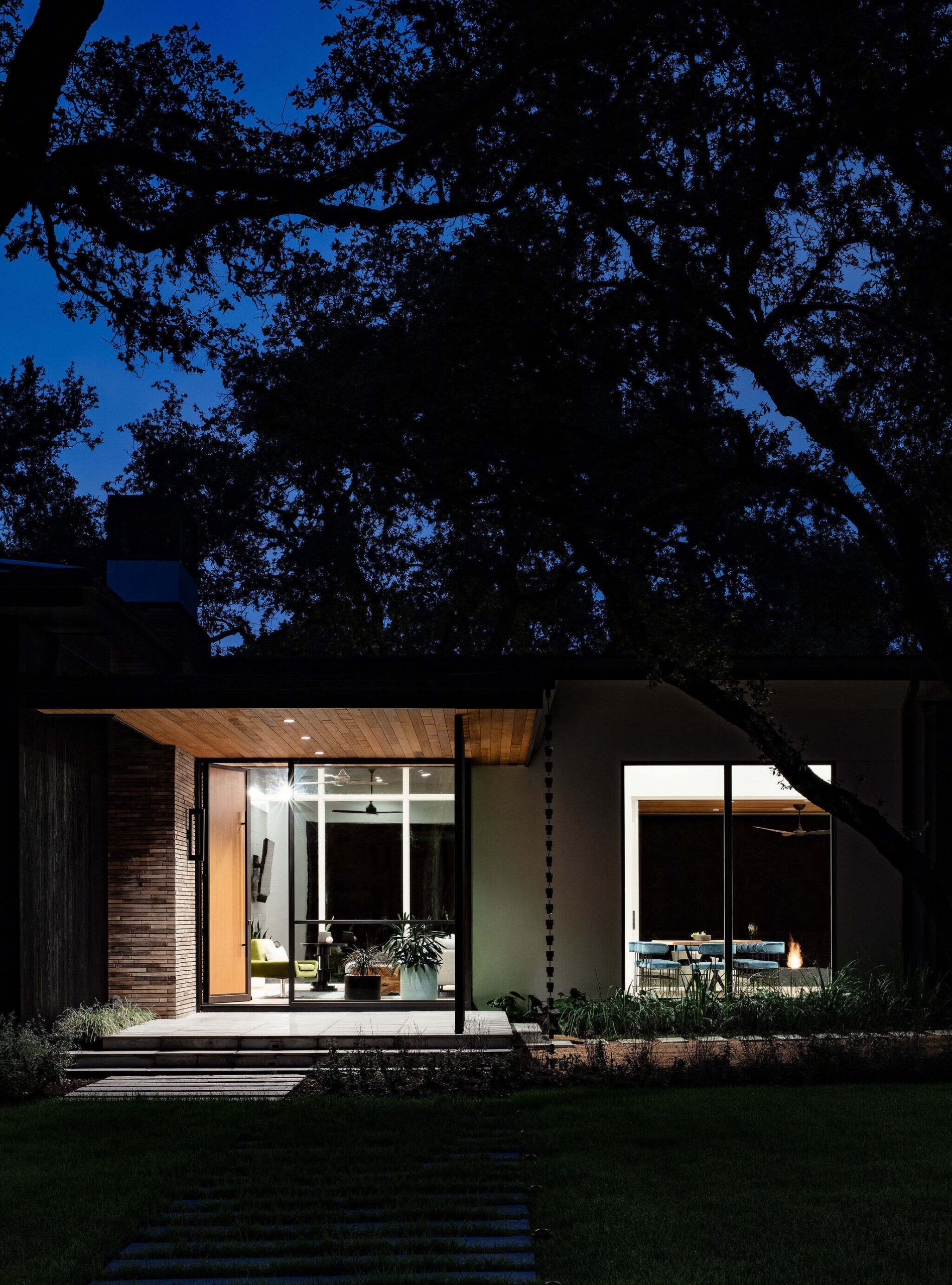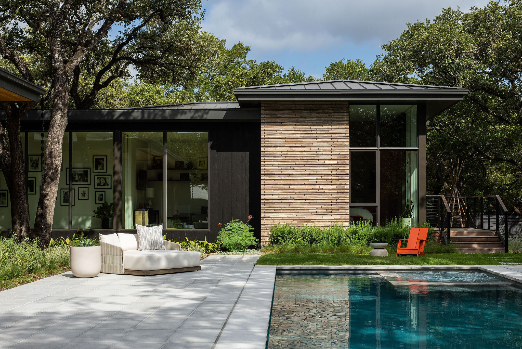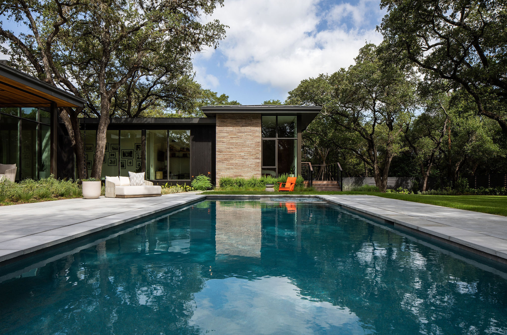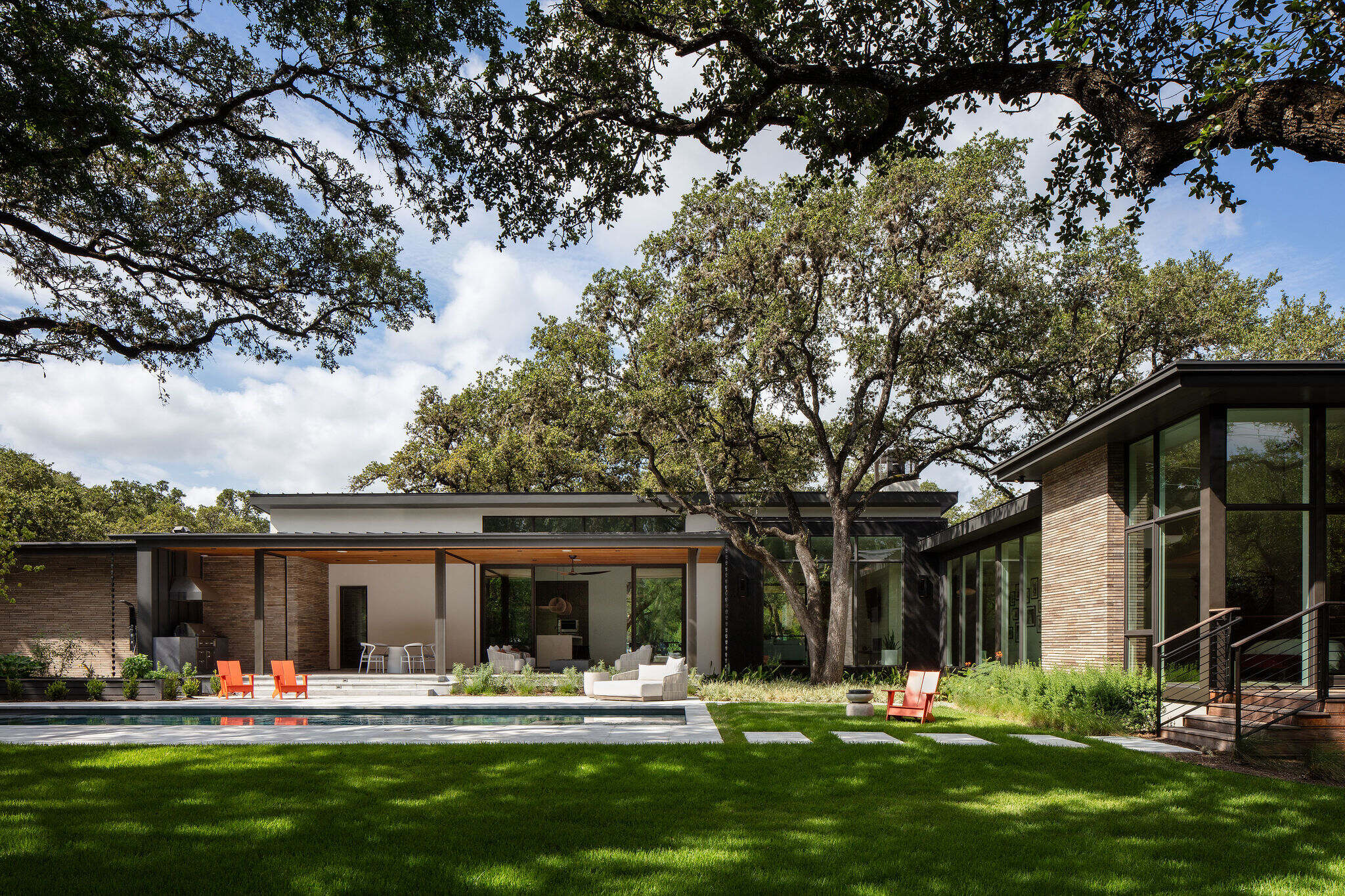 Located in the heart of the eclectic Barton Hills neighborhood, this contemporary custom residence provides a true sense of indoor/outdoor living as it is nestled amongst a grove of heritage oak trees on nearly an acre lot. Balancing natural materials that blend from outside in, with sharp modern detailing, the result is a home that effortlessly combines an elevated sense of warmth punctuated by the colorful energy of the urban neighborhood.