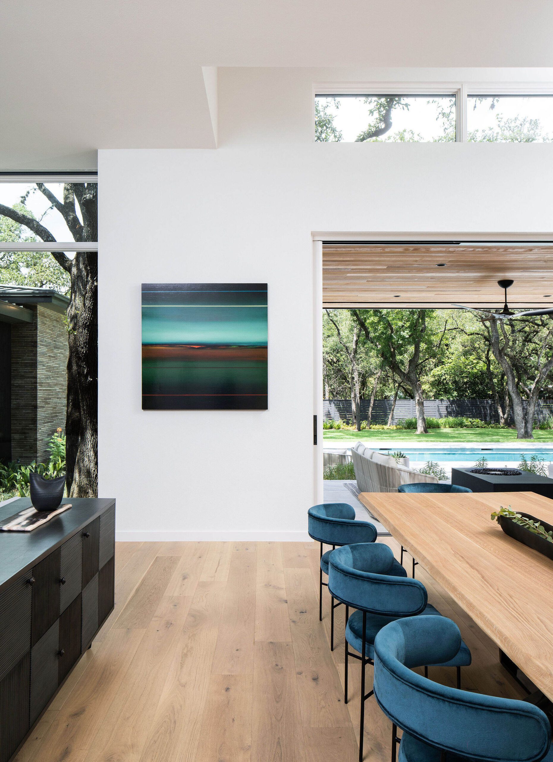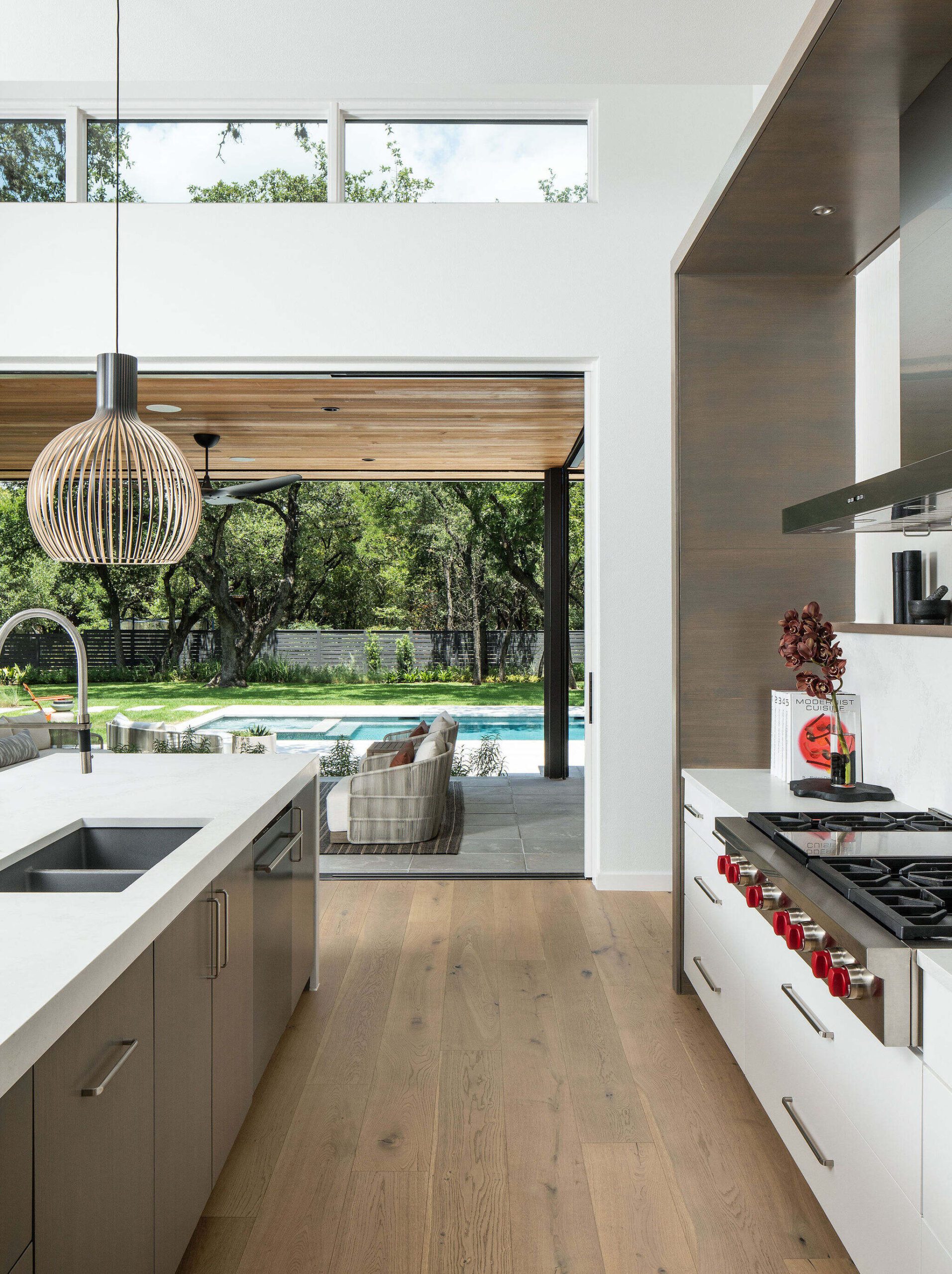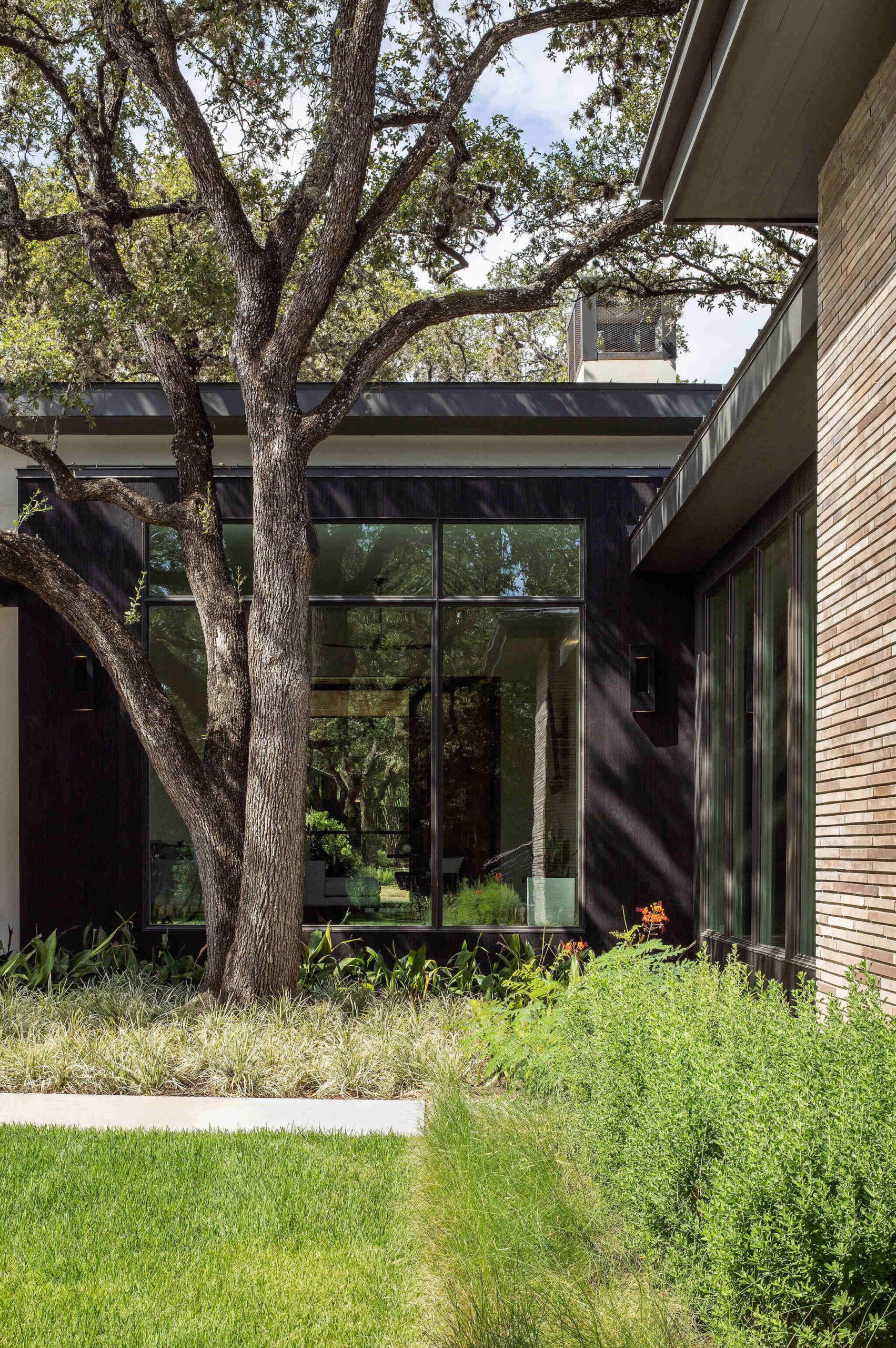 Located in the heart of the eclectic Barton Hills neighborhood, this contemporary custom residence provides a true sense of indoor/outdoor living as it is nestled amongst a grove of heritage oak trees on nearly an acre lot. Balancing natural materials that blend from outside in, with sharp modern detailing, the result is a home that effortlessly combines an elevated sense of warmth punctuated by the colorful energy of the urban neighborhood.