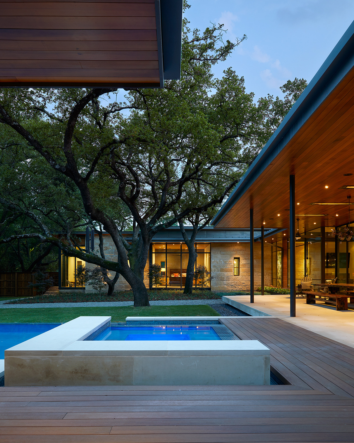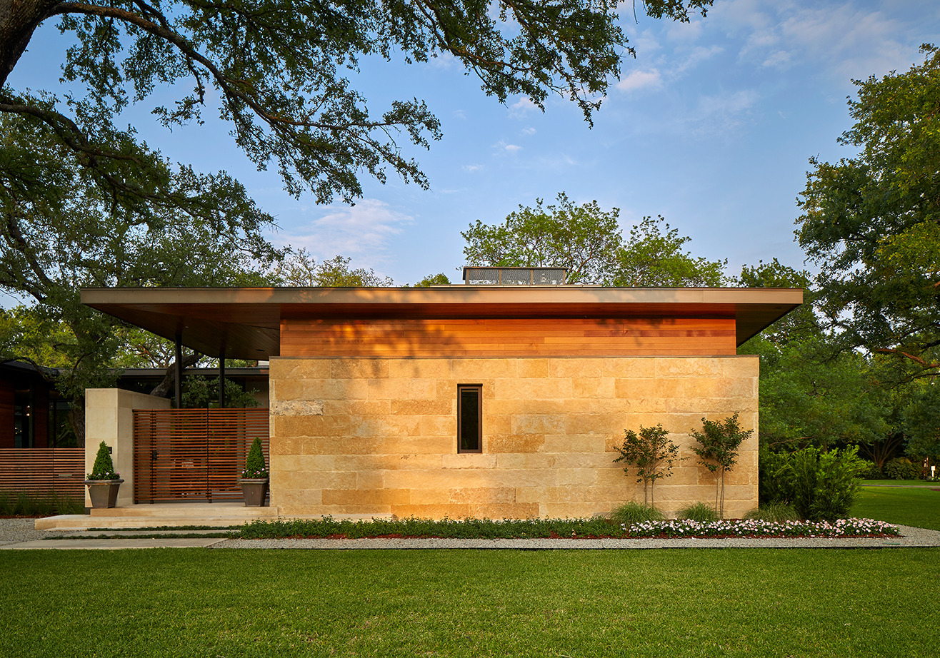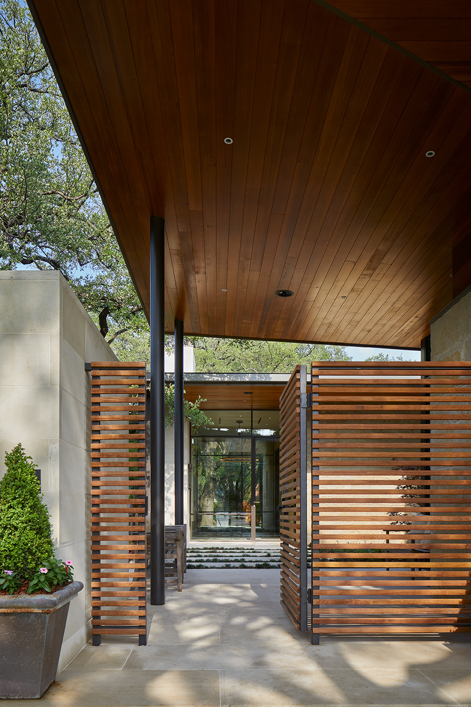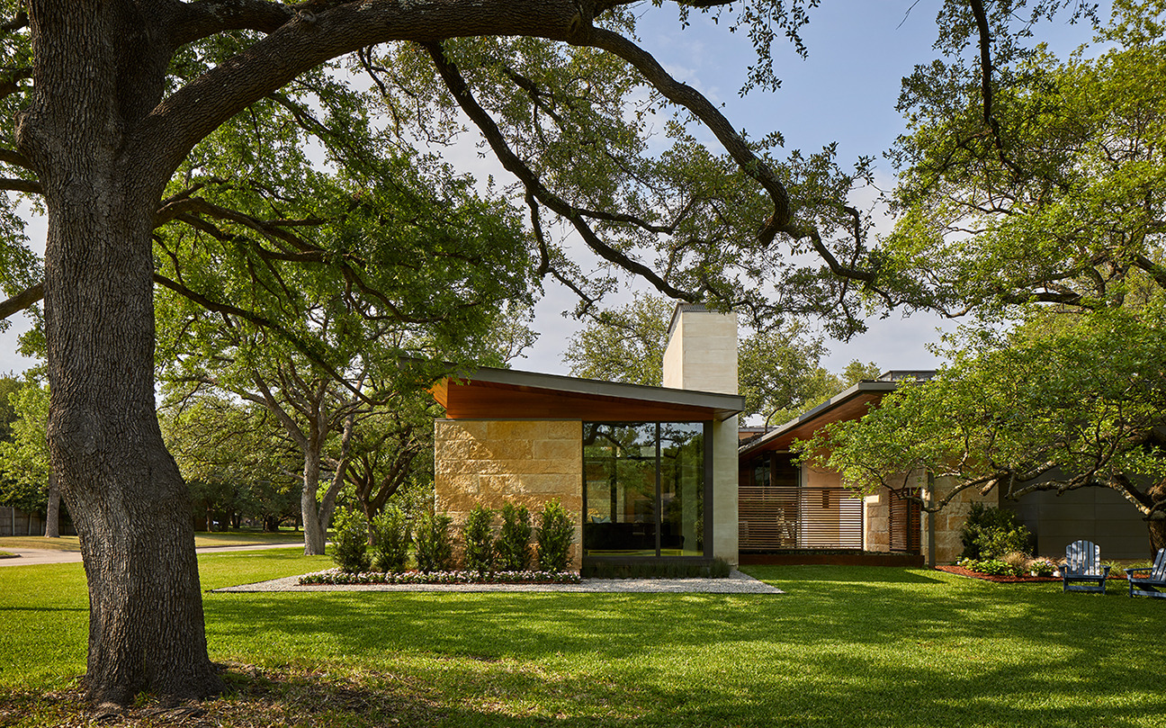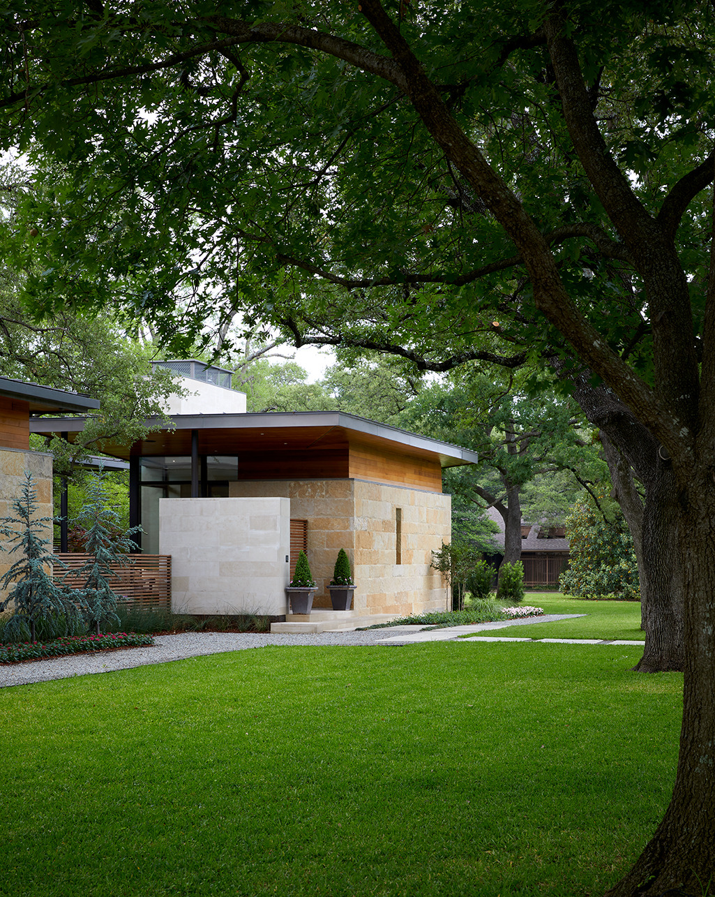 Located on prestigious Strait Lane in Dallas, Texas, this regional contemporary residence nestles and wraps its roots amongst the mature oak trees, appearing merged to the site for quite some time in this beautifully rare park-like setting. Sliding glass doors at both the dining and kitchen areas open up to the outdoor living patio; great for entertaining, a program requirement established by these spirited homeowners.