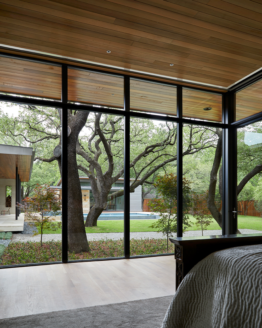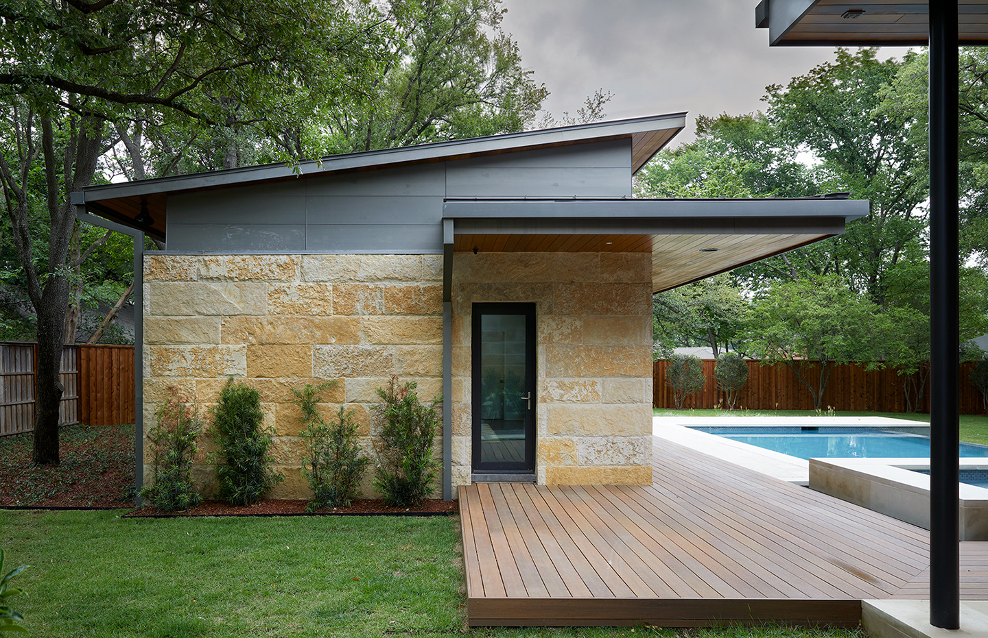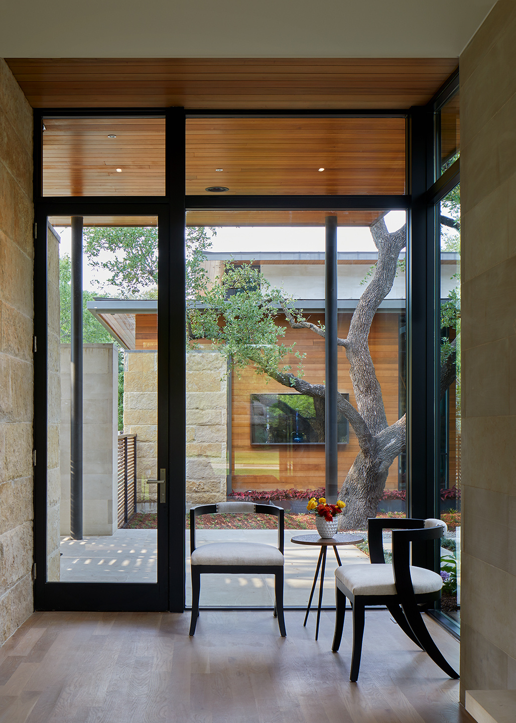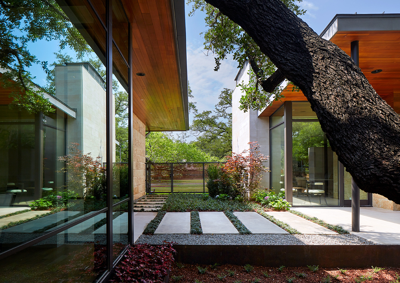 Located on prestigious Strait Lane in Dallas, Texas, this regional contemporary residence nestles and wraps its roots amongst the mature oak trees, appearing merged to the site for quite some time in this beautifully rare park-like setting. Sliding glass doors at both the dining and kitchen areas open up to the outdoor living patio; great for entertaining, a program requirement established by these spirited homeowners.